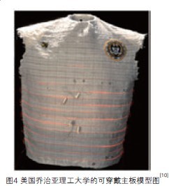 3 . 1智能衣智能衣的概念是基于美国乔治亚理工大学的可穿戴式主板(The Georgia Tech Wearable Motherboard)模型(见图4)提出的,该模型最初的研发目的是为战时救护提供方便快捷的服务。智能衣的外观一般为整合了多种生理信息传感器的衬衣或者胸带,集监测、诊断、治疗以及通讯等功能为一体,穿在身上可以实现生理信息的实时获取、分析和传输。
