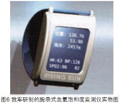 3.2腕带式测量设备腕带式测试设备测量方便、易于携带,常用于个人日常健康护理和特殊人群体征监测。我军在该领域已研发出具有一定成熟度的产品:总后卫生部信息中心与航空医学研究所联合研制的腕表式血氧饱和度监测仪(见图6),可实现24小时实时监测脉搏波、手动加速度、血氧饱和度、心率和位置等生理参数,并将接收到的信息发送到手机、其他健康终端设备或远端监控服务器。该仪器目前已完成试用,效果良好,为基层特别是高原医疗保障提供了新的服务模式。
