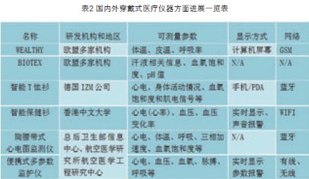 3.4其他研究进展近年来,各国加大了对穿戴式医疗仪器的研发力度,产品层出不穷。详见表2。