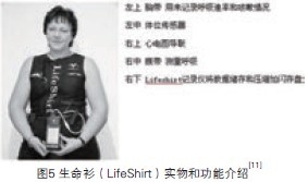 智能衣的典型应用还包括美国的生命衫(L i f e S h i r t)和欧洲的WEALTHY等。生命衫(见图5)是全球首款可实现无创、连续和可移动地收集生理参数的监护系统,目前正在全世界超过1000家医院中应用,嵌入生命衫的传感器可以在穿着者的日常活动中记录30多个心肺生理参数。生命衫与其它外围设备相连时,还可以测量血压、血氧饱和度、体温和皮温等生理参数。数据可通过网络传送给临床医生,以便作出准确的诊断。