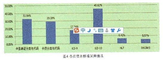 3.1.3信息化建设投入不足,信息标准应用低医院信息化建设需要大量的资金投入, “十一五”以来我国中医药信息化建设投资规模呈高速增长态势,2012年中央拨付1.76亿元专款支持国家扶贫开发工作县中医医院信息化服务保障能力建设。但除国家拨付专款支持外,45.76%的医院却没有固定经费预算开展信息化建设,部分只投入区区几千元,未能执行《中医医院信息化建设基本规范》 “中医医院应将信息化建设经费平均投入应达到年医疗业务总收入的1%—5%”的规定。目前,虽然医院各类信息标准规范还不能完全满足当前医院信息系统的建设需求,但最基本的国际疾病分类(ICD—9、ICD-10)、 《中医病证分类与代码》和《中药分类与代码》等标准却没能在医院得到充分应用,将严重影响医院信息化长远发展、区域卫生信息平台建设。