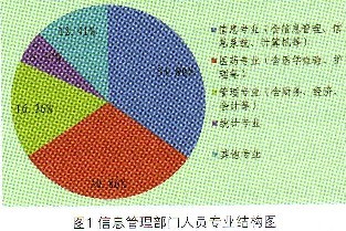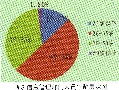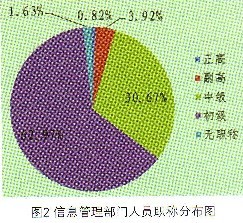 在497家建立了信息管理部门的医院,平均每家医院在编人数2.02人,远远低于中国医院协会信息管理专业委员会(CHIMA 2009/2010年度)的统计数据7.07人。从信息管理部门人员专业结构上看,信息专业(含信息管理、信息系统、计算机等)占总人数的34.8%,医药专业(含医学检验、护理等)人数占30.86%,管理专业(含财务、经济、会计等)人数占16.36%,统计专业人数占5.57%,其他专业人数占?2.4 7%。从学历结构看,64.46%的人员为大专及以下学历,几乎没有硕士研究生及以上学历。从人员职称上看,初级职称和无职称人数占总人数的64。6%,中级职称占30.67%,而高级职称仅占4.74%。从人员的年龄层次上看,信息人员的年龄主要集中在26岁至50岁,占总人数的85.27%,25岁以下占1 2.93%,50岁以上仅占1.8%。信息管理部门负责人50.17%的为医药专业,只有17.63%为信息专业;62.7 1%的具有中初级职称,只有18.82%为高级职称(见图1、2、3)。