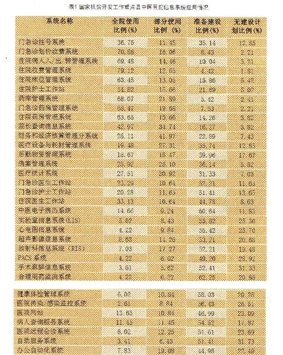 3.1.4系统应用程度较低,信息资源共享少国家扶贫开发工作县中医医院信息系统普遍存在重复建设、低水平建设的现象,仍停留在门急诊划价、住院病人入出转管理、住院收费管理、药库管理、门急诊药房管理等基本信息系统上,应用程度低,涉及医疗信息系统、信息资源分析利用的系统较少,特别是涉及中医医疗信息的系统就更少了, 中医电子病历使用的太少、几乎全部是文本格式,在办公自动化、自助服务、检查检验、手术麻醉、合理用药、传染/感染监控等信息技术应用上非常少。一位病人的医疗信息来源广、采集渠道多,共享能力差,使得信息资源利用率低下,不利于医院医疗服务的深度研究。