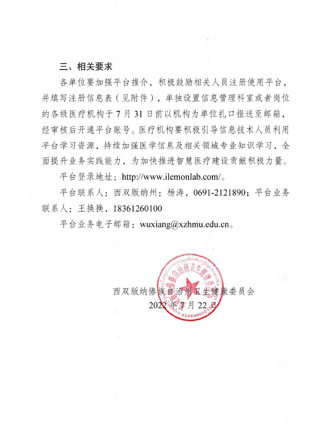 公司吴响副经理团队研发的医学信息终身教育平台继今年5月被徐州市卫健委在全市范围内推广使用以来,又获云南省西双版纳傣族自治州卫健委认可和支持,在全自治州推广使用,当地三甲医院及数十家医疗机构(基层卫生机构)的信息部门将以实名制接入平台。