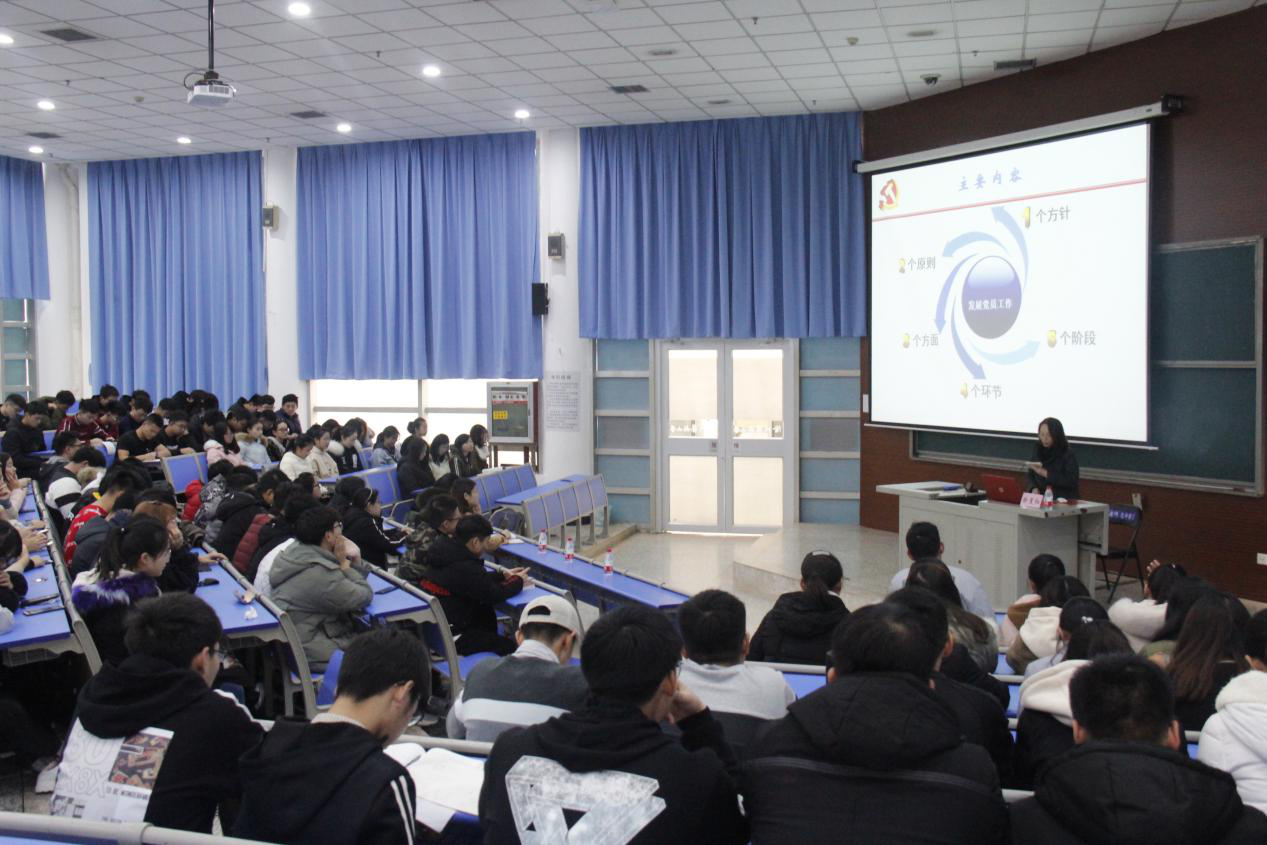 会上,徐夏红老师从“一个方针、两个原则、三个方面、四个环节、五个阶段”等方面详细介绍了发展党员的组织原则、纪律要求和工作程序。首先,徐老师指出“控制总量、优化结构、提高质量、发挥作用”的发展党员工作总方针,提出在发展党员过程中必须坚持入党自愿和个别吸收两个原则,并从思想、程序、材料三个方面严格考察发展对象,把政治标准放在首位,严格控制党员发展的数量和质量。随后,徐老师重点介绍了发展党员过程中“培养、吸收、归档、接转”四个环节,强调了抓好“预备党员、发展对象、入党积极分子、申请人入党以及正式党员”五个阶段教育和培养的重要性和规范性。最后,徐老师鼓励同学们在思想和言行上严以律己,积极向党组织靠拢,接受党组织考验。