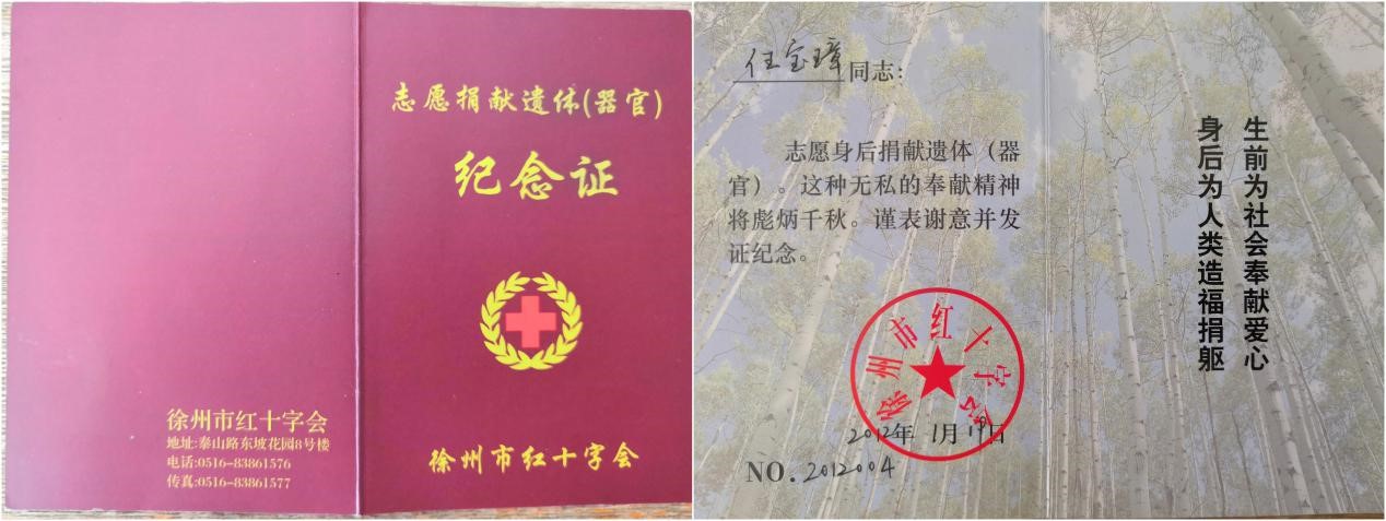 志愿者捐献遗体纪念证上印着:“生前为社会奉献爱心,身后为人类造福捐躯”,背景是一片高耸的森林。老兵就像是一颗苍天大树,生前为百姓遮阳避雨,身后愿为柴为柱生火筑房。