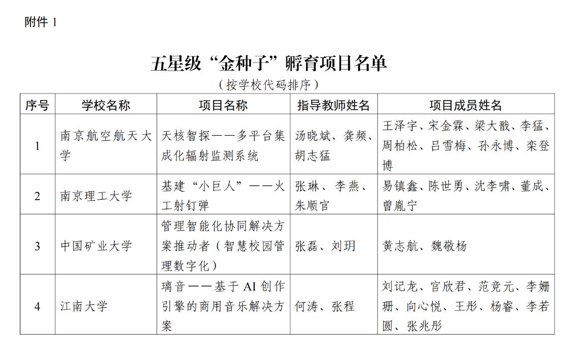 近日,2023年江苏省高校创新创业“金种子”孵育项目遴选结果公示,经学校推荐、省级初选、项目路演、实地考察等环节,全省共评选出20个五星级、32个四星级和48个三星级“金种子”孵育项目。