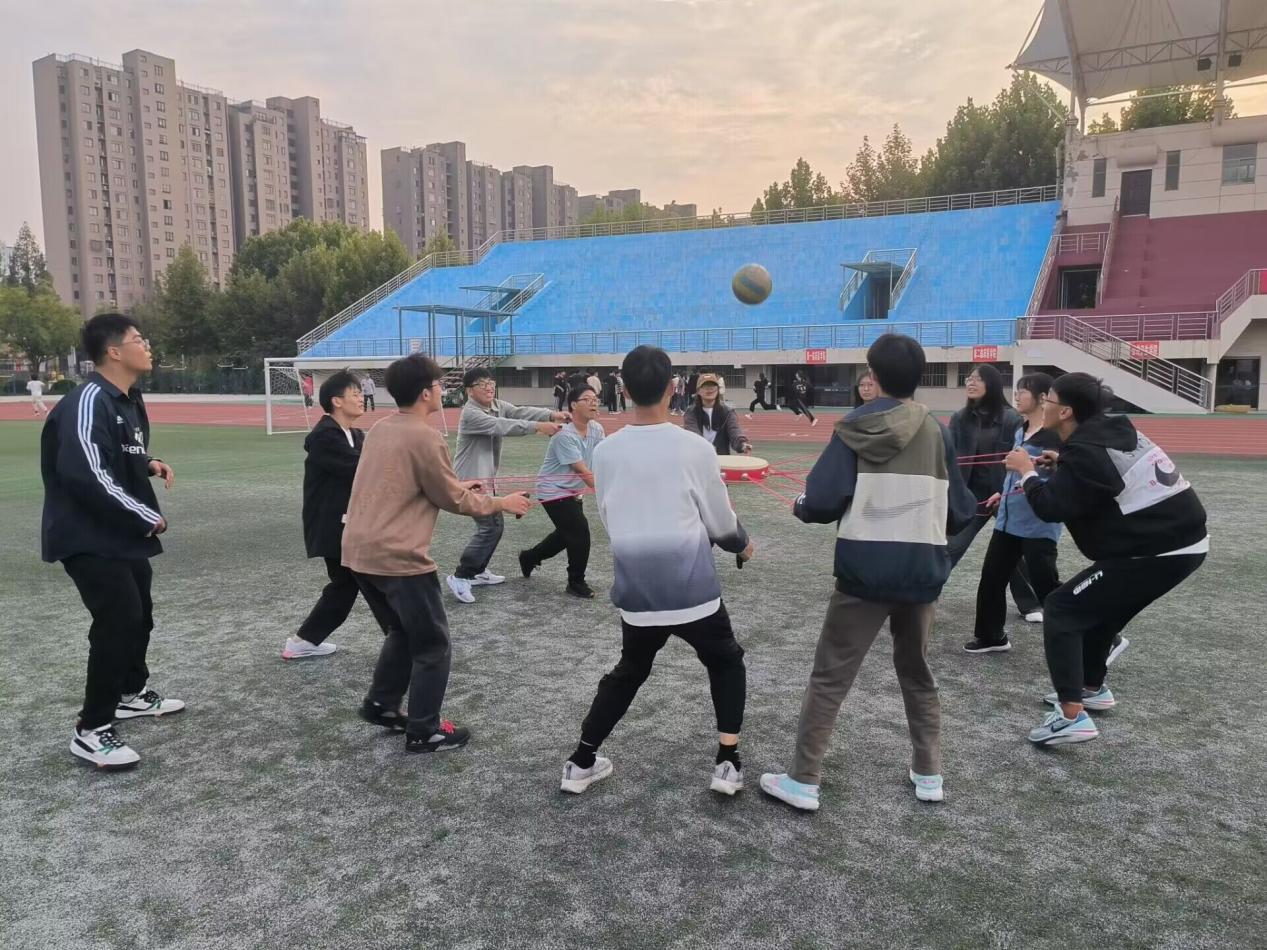 每组同学以鼓为圆心,围成圆圈,分别握住一根缠绕在鼓上的绳子,选出一位成员负责将球置于鼓上,其余成员则负责拉起鼓,团队合作控制拉力大小、方向来控制鼓上下移动垫球,3分钟内垫球次数最多的小组获胜。这项活动非常考验队友间的默契,每位组员力度、发力方向一旦配合不好球就会飞出。同学们在15分钟的短暂练习时间里慢慢摸索尝试,培养默契,从一开始的排球敲击一两次、两三次就会掉落,到能垫球十余次,击球效果渐入佳境。最终,在3分钟比赛时间里,小组最多取得了垫球118次的好成绩。