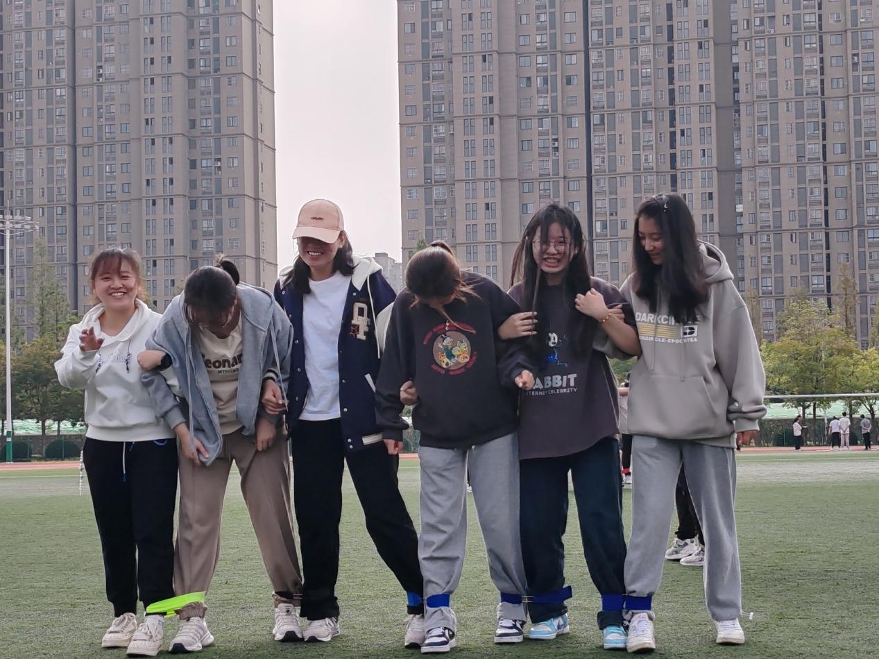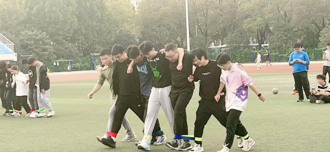 在多人多足游戏中,每组分成两队,每小队成员用绳子将相邻两人的相邻脚绑在一起,错开站成两排分别进行接力,用时最短到达终点线的小组获胜。练习中,同学们从刚开始的磕磕绊绊,速度缓慢,慢慢摸索出技巧,在比赛中,各组同学步伐一致,齐心协力,配合默契,都取得优异成绩。