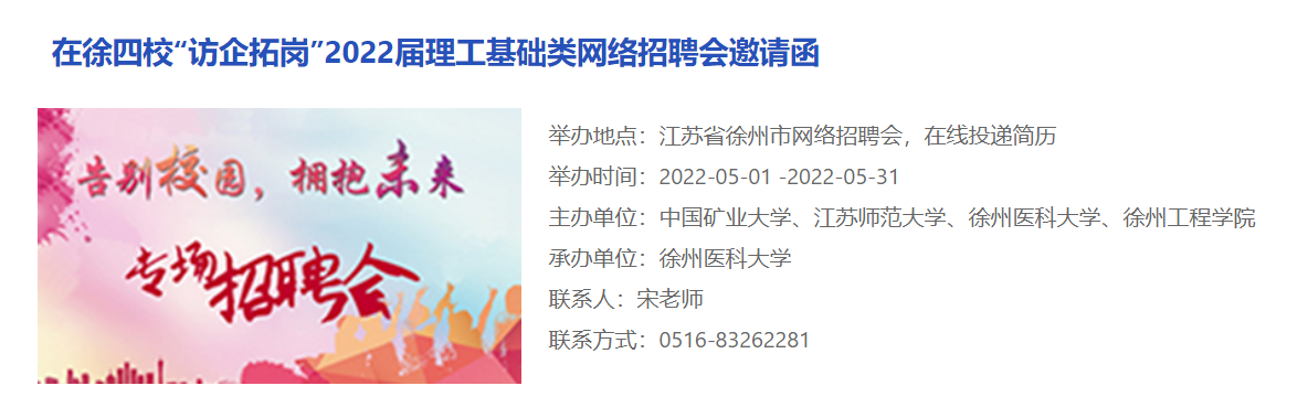 为贯彻教育部“访企拓岗位促就业”要求,落实“就业百日冲刺”工作计划,304.cam永利集团聚焦员工需求、聚合生源专业、聚集企业资源、聚拢就业岗位,协同在徐四校举办理工基础类等专场网络招聘会,为用人单位输送优秀人才,助力在本院毕业生充分就业。