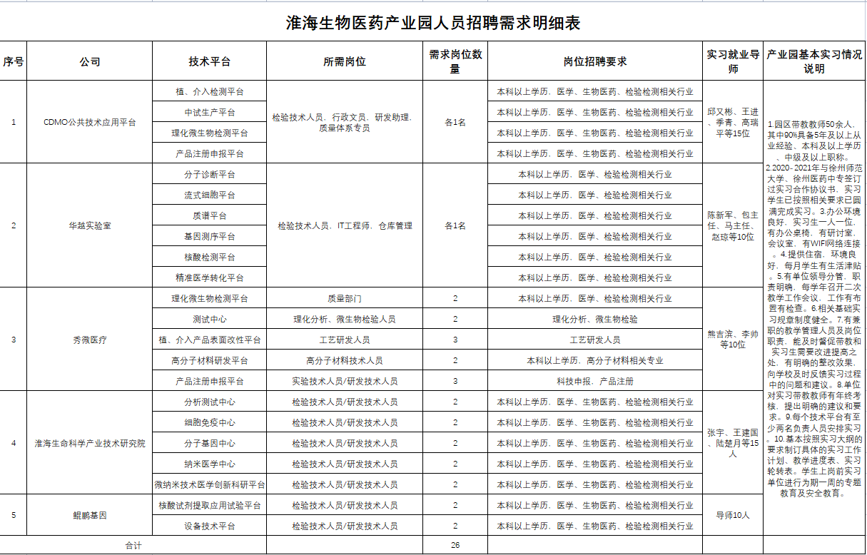 本次招聘会,汇聚了徐州淮海生物医药产业园内医疗器械 CDMO 公共服务平台、秀微医疗、淮海医学检验所、江苏华越医疗器械投资有限公司(徐州公司)、徐州金泰克公司、鲲鹏(徐州)科学仪器有限公司等多家实力强劲,技术先进的企业,为公司毕业生提供工作岗位26个。